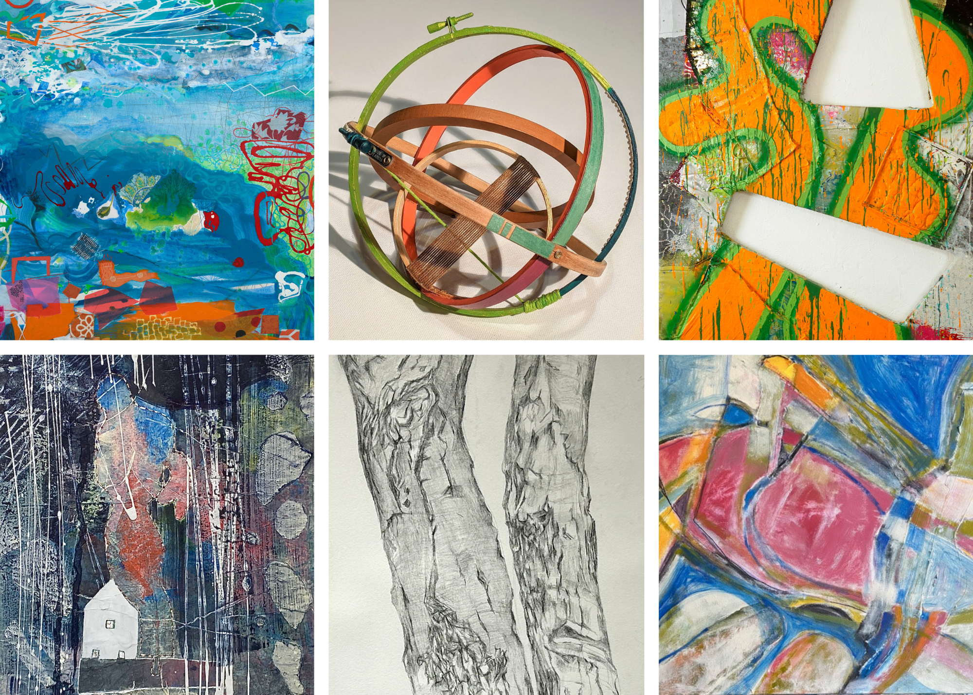 Alyce Gottesman, Gail Meyers, and Alan Neider explore textiles, geometry, and color in Material Matters. Across painting and sculpture, each artist incorporates fabric and mixed media to build complex, tactile surfaces. Neider’s boldly constructed canvases juxtapose cut geometric voids with expressive, graffiti-inspired forms, while Gottesman’s atmospheric abstractions weave together landscape, memory, vivid color, and intuitive mark-making. Meyers’s sculptural works extend these themes into three dimensions, assembling spherical forms that balance structure and openness. Together, the works create a vibrant and boisterous dialogue between order and improvisation, density and space, where line and shape become both functional and expressive tools.